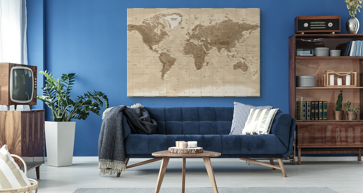 Schilderij - Beige bruine Wereldkaart , Wanddecoratie , Premium print - 100x70