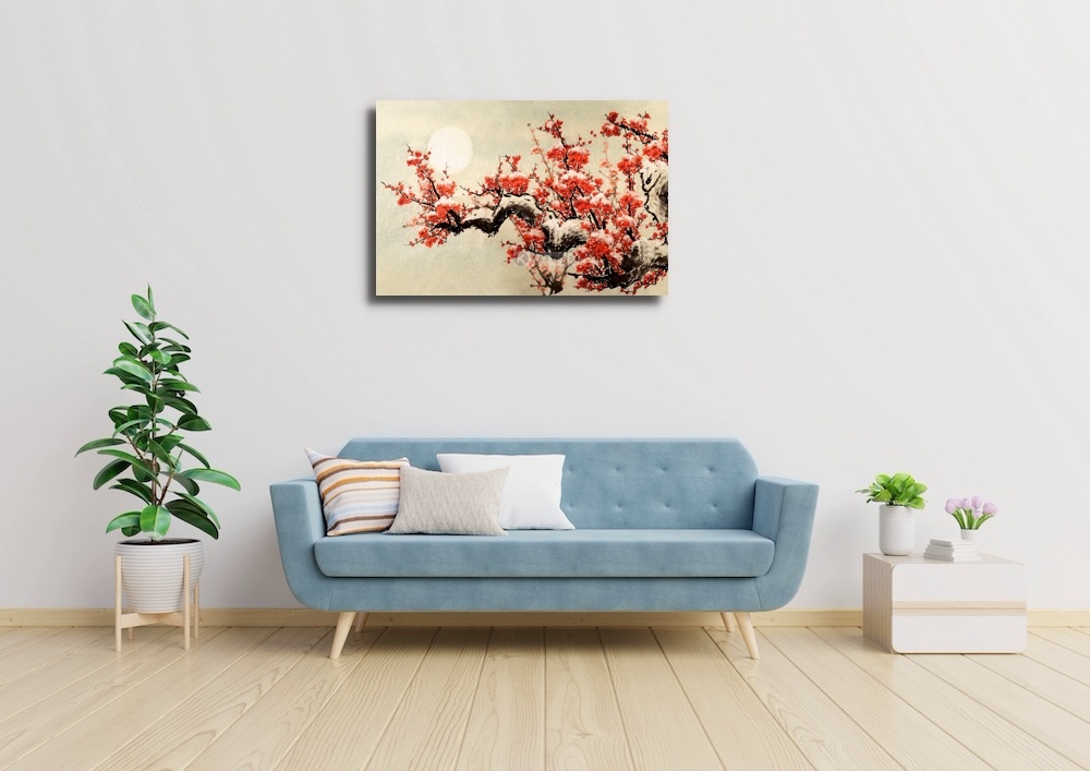 Schilderij - Pruimenbloesem, rood, geel , 2 maten , Premium print, Wanddecoratie, Eyecatcher aan de muur