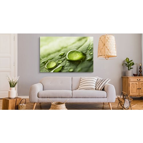 Schilderij - Waterdruppels op een blad, Groen, Premium Print