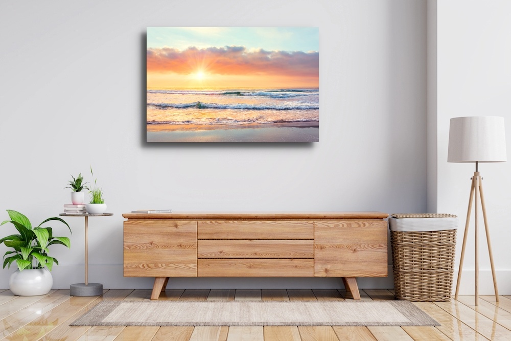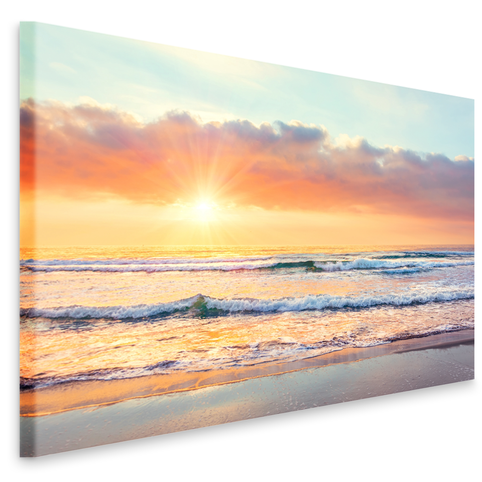 Schilderij - Zonsondergang op het strand, prachtig zicht op de Noordzee, premium print in 2 maten, wanddecoratie
